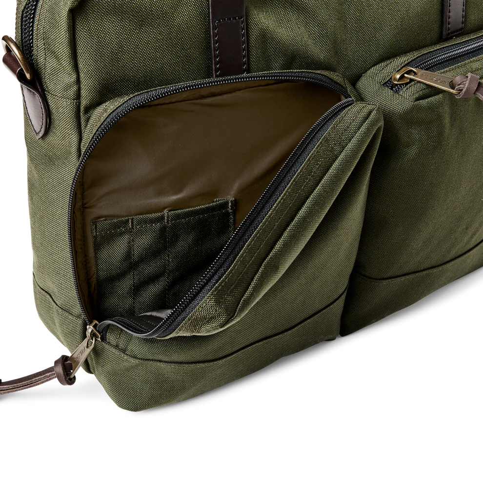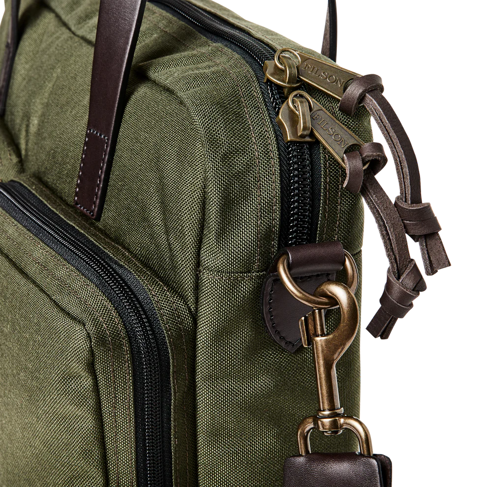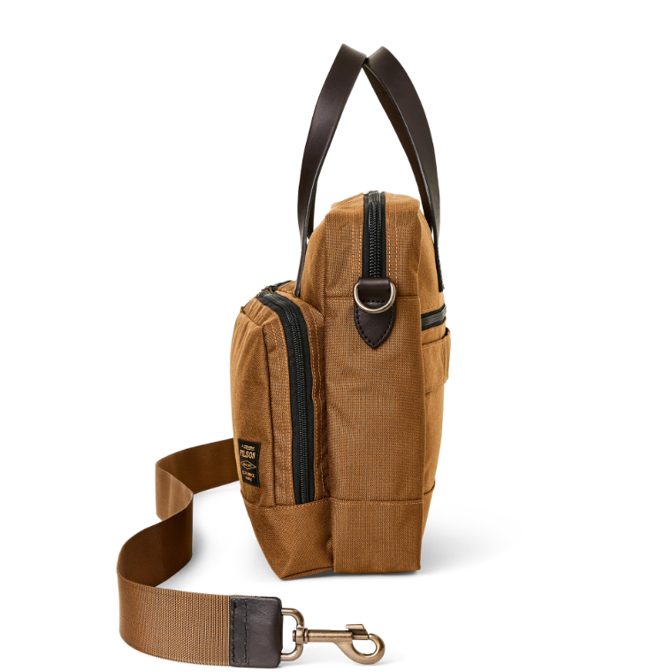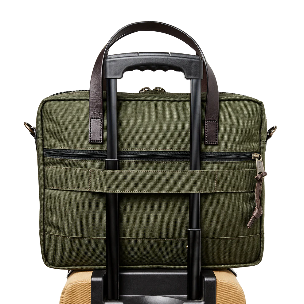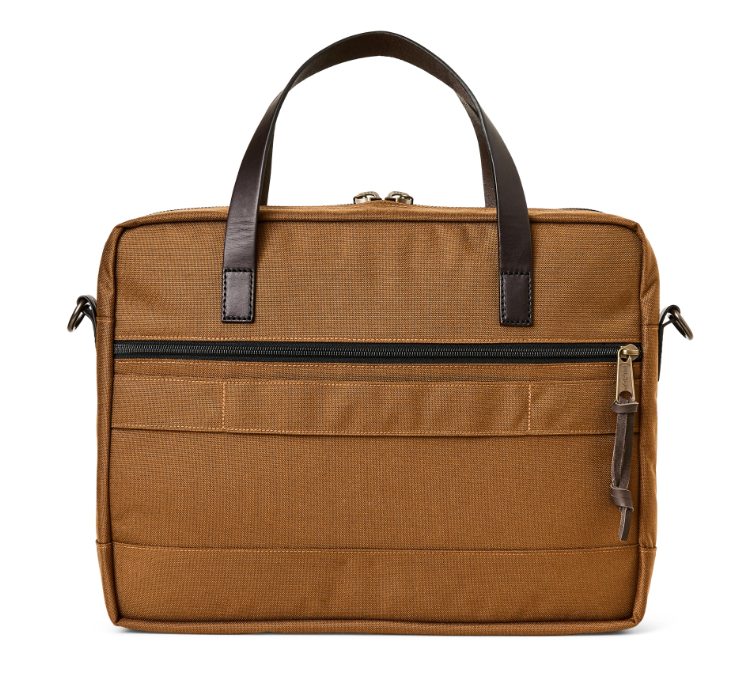 The versatile Dryden Briefcase is made of abrasion-resistant 1000D Cordura® nylon that shrugs off the abuse of daily carry. This fabric is legendary for its ability to withstand abrasion and, sharing the same weave as ballistic nylon, its resistance to punctures and tears is exceptional. A padded sleeve fits laptops up to 16". The trolley strap on the back enables securing the bag over luggage handles. Features large exterior pockets for organizing quick-access essentials. Removable, adjustable shoulder strap.