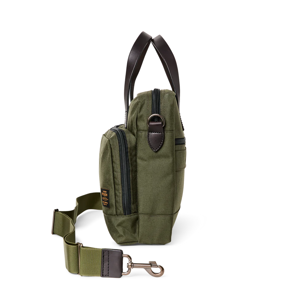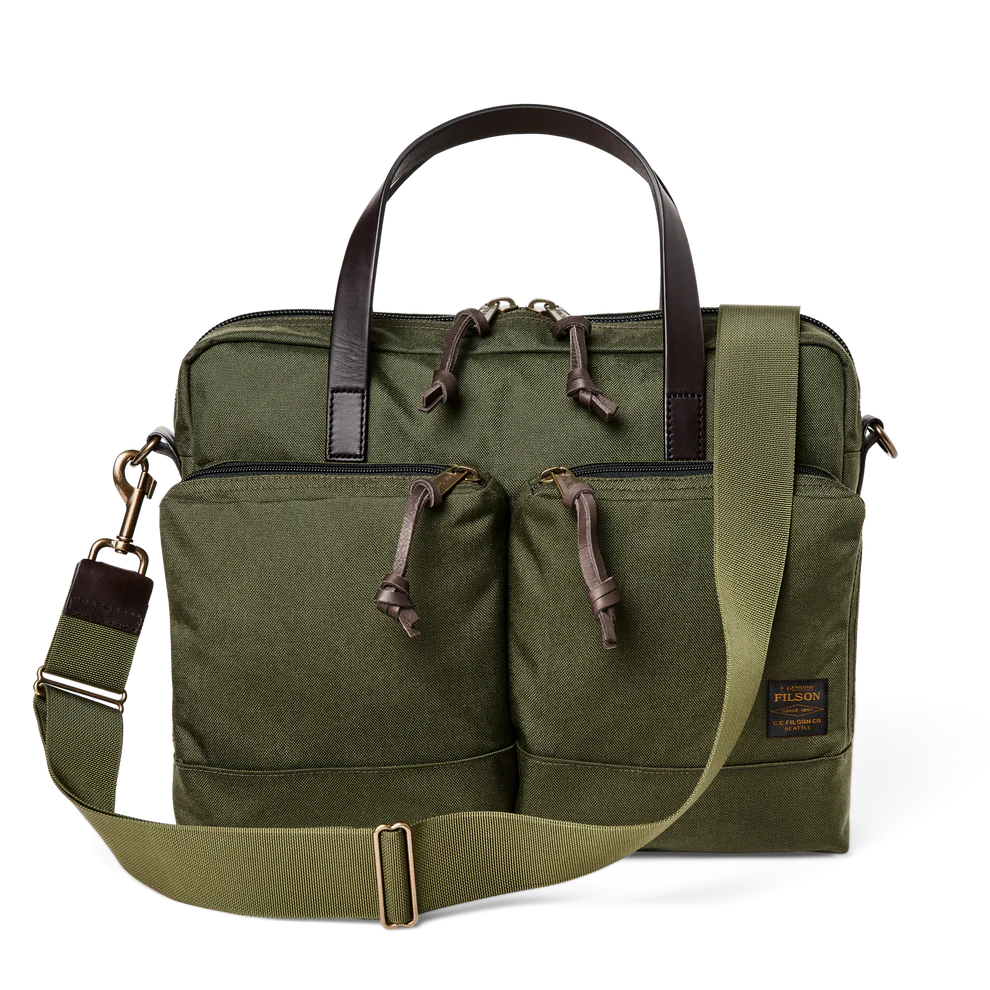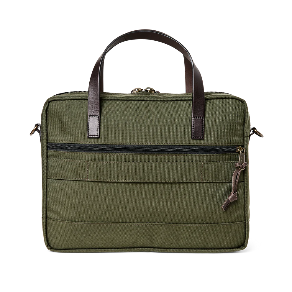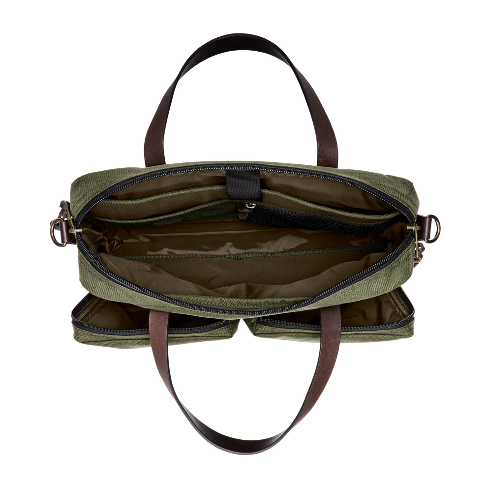 The versatile Dryden Briefcase is made of abrasion-resistant 1000D Cordura® nylon that shrugs off the abuse of daily carry. This fabric is legendary for its ability to withstand abrasion and, sharing the same weave as ballistic nylon, its resistance to punctures and tears is exceptional. A padded sleeve fits laptops up to 16". The trolley strap on the back enables securing the bag over luggage handles. Features large exterior pockets for organizing quick-access essentials. Removable, adjustable shoulder strap.