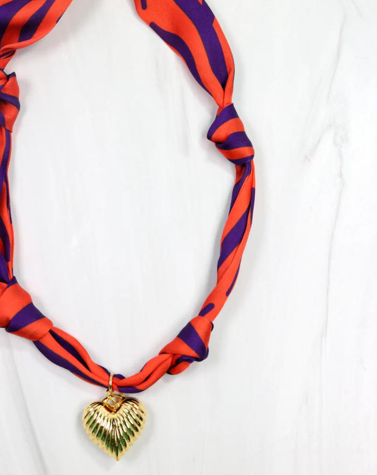 Elevate your look with the Serafina Scarf Charm Necklace featuring a playful Purple and Orange print. This satin-feel scarf is accented by a ribbed puff heart charm pendant, adding a playful yet chic touch. Designed with two stylish knots and a tie-back closure, it offers adjustable comfort and a perfect fit for any outfit.
