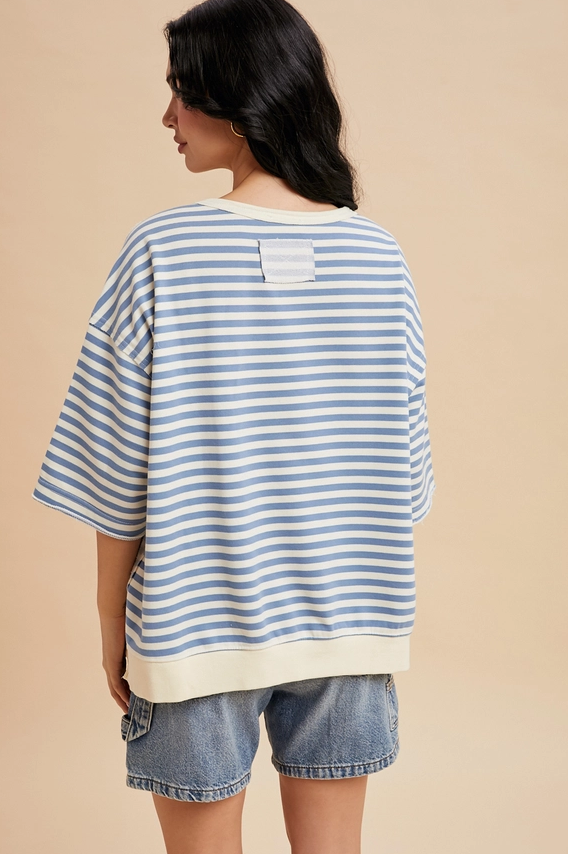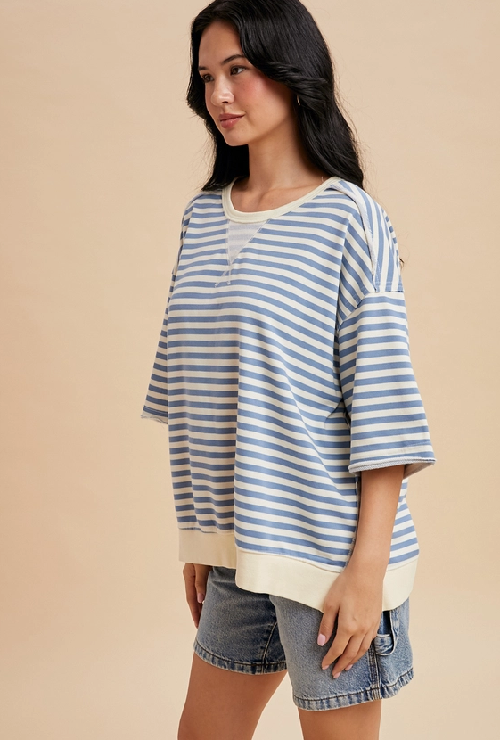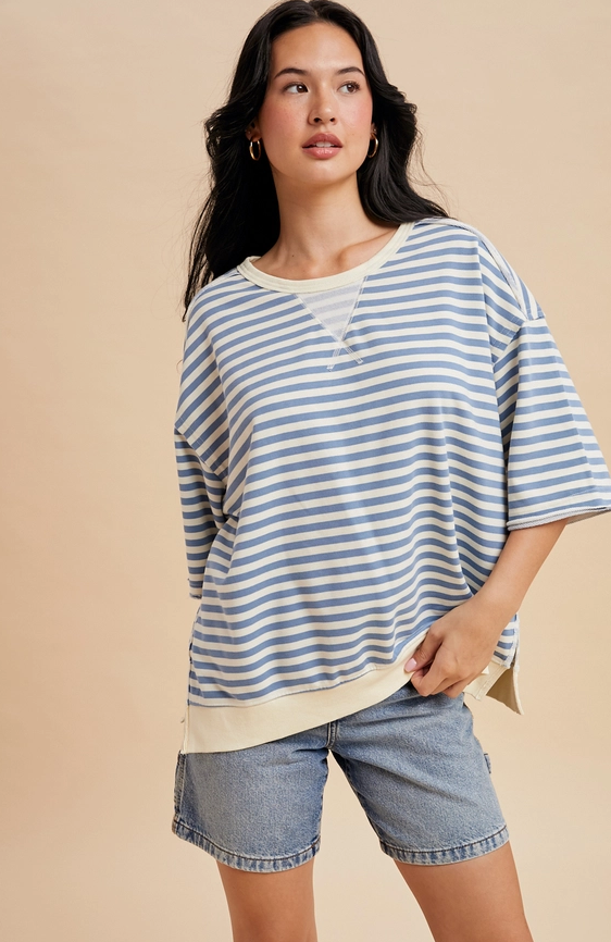Easy french terry top features oversized fit, raw edge seams, contrasting ribbed banding, drop sleeves, and garment washing for that vintage lived in feel.