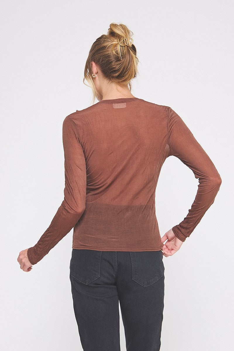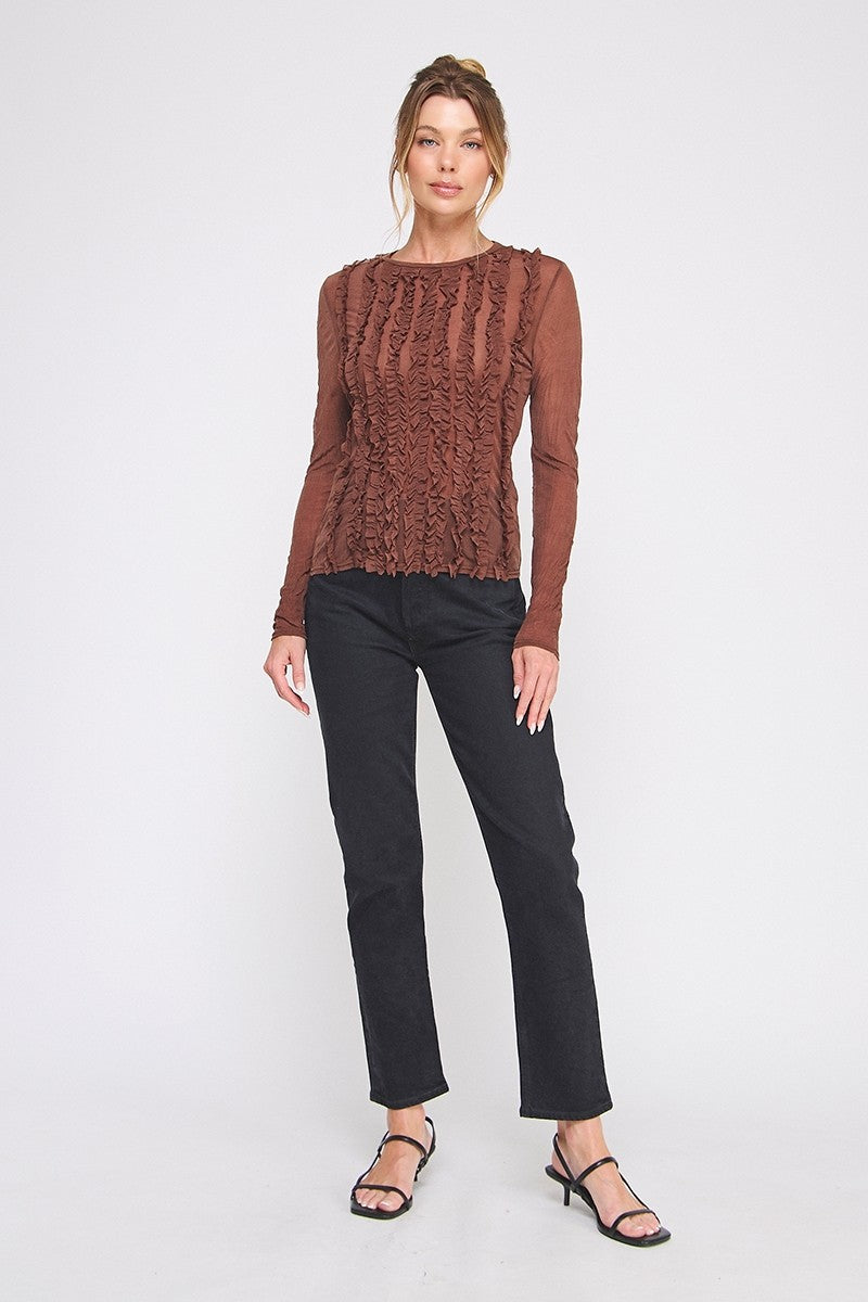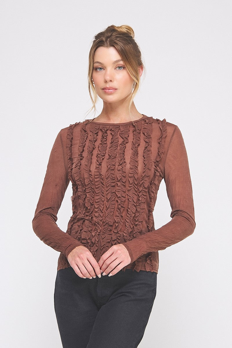 Add a touch of whimsical charm to your wardrobe with the Brynn Crinkled Silky Sheer Long Sleeve. Its delicate crinkled texture and silky sheer fabric bring a light, airy feel that’s perfect for layering or stealing the spotlight. Effortlessly flirtatious and endlessly fun, this top dances with every move, making you feel ready for anything from brunch to a night out.