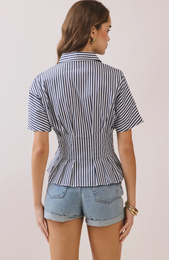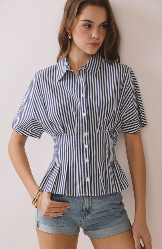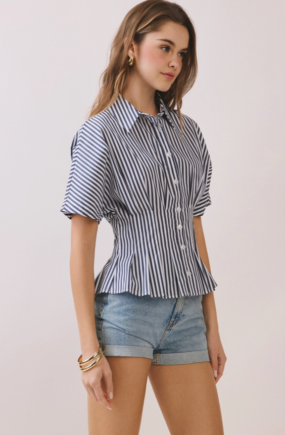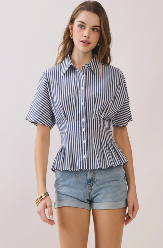 A striped woven shirt featuring a classic pointed collar and button-up front. Designed with short sleeves and a fitted waist that flows into a subtle peplum hem for a flattering silhouette.