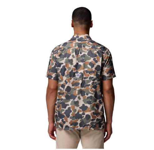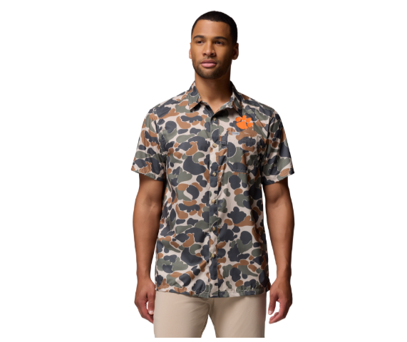 Ideal for summer, this Columbia Clemson Collegiate short-sleeve has it all: whimsical tropical pattern, built-in sun protection, sunglasses-cleaning patch, and school spirit.