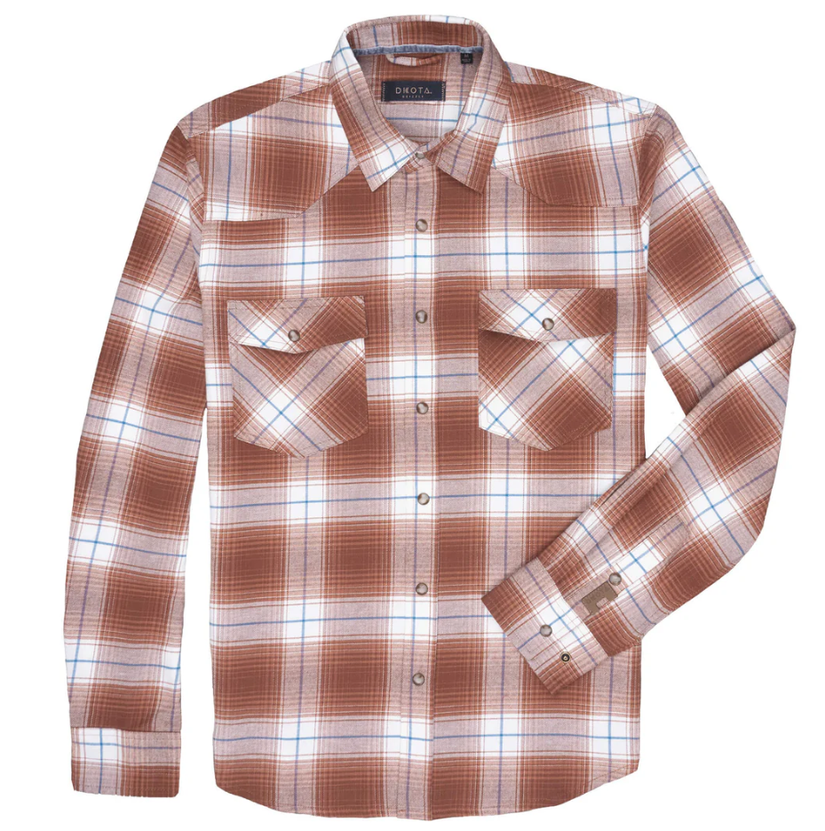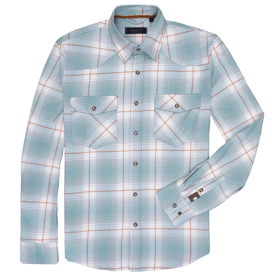 DUTTON returns with a fresh take on American ombre patterns. The rich, pewter-rimmed pearl snaps, velvet neck trim and embroidered DKOTA chevron are the perfect embellishments.