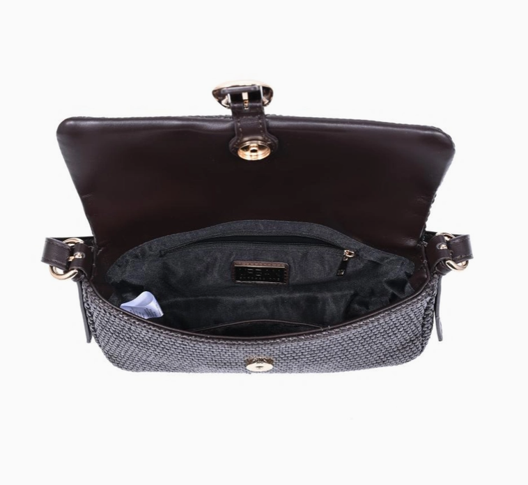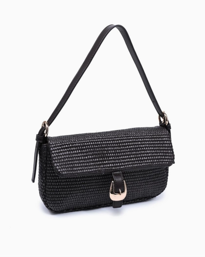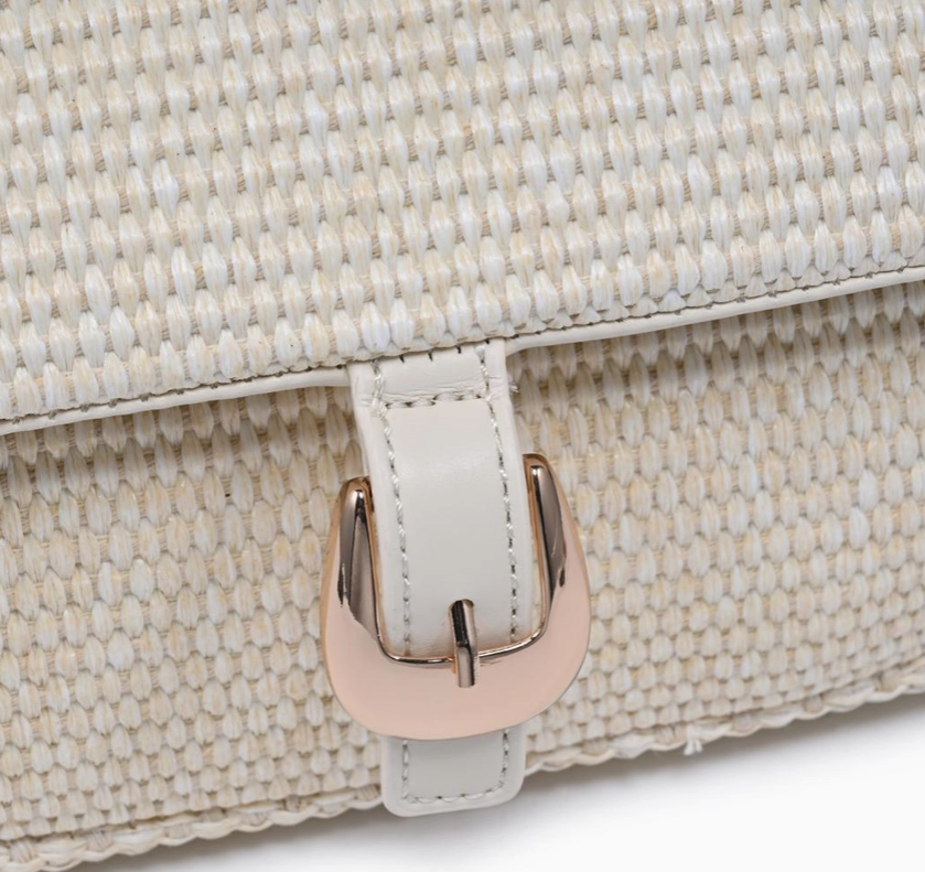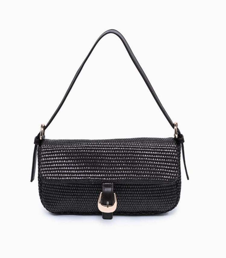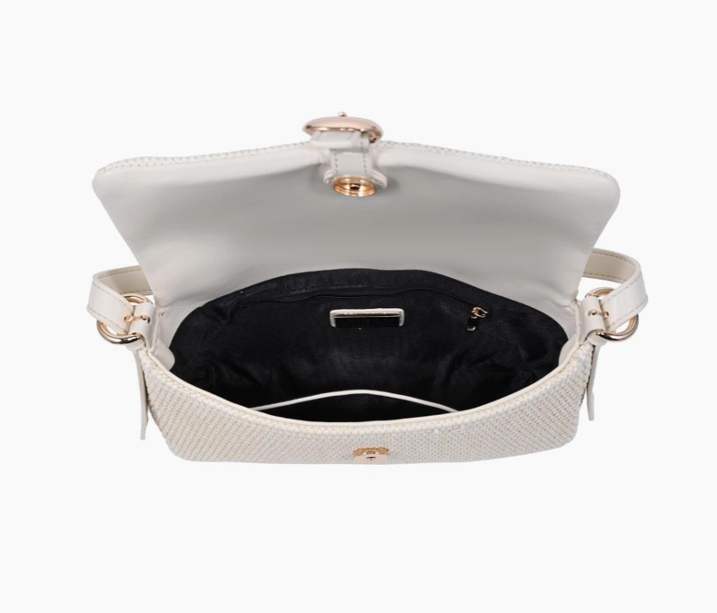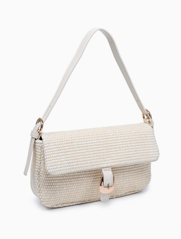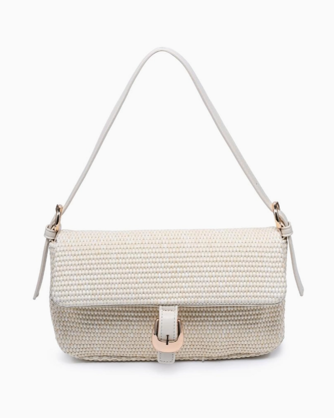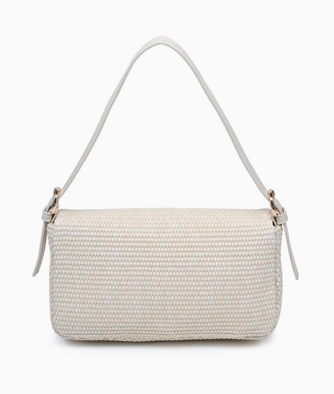 Woven baguette silhouette with buckle-front flap. Gloria Straw Crossbody blends textured straw weave, a sleek shoulder strap, and a neat buckle detail. Compact baguette shape accommodates essentials with a structured profile, making it a versatile shoulder bag for daytime and evening looks. Modern, tactile, trend-aware, a refined addition to seasonal wardrobes that pairs easily with casual and polished outfits.