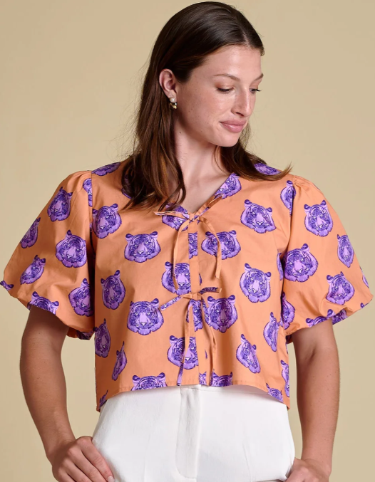 Stewart Simmons Puff Sleeve Top with Tiger Heads
