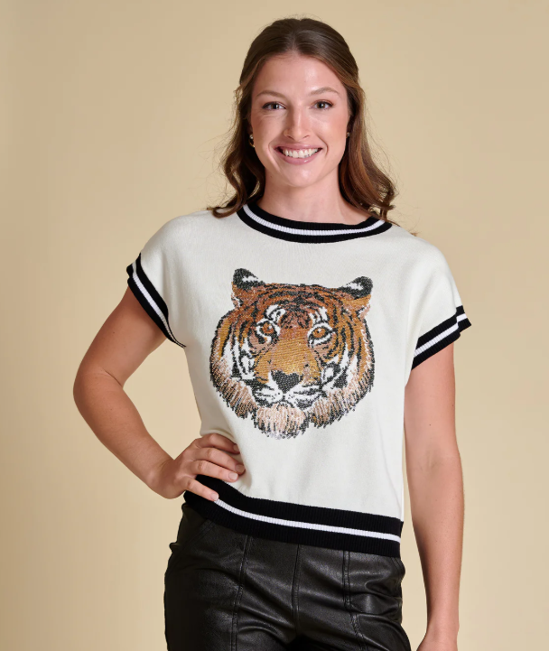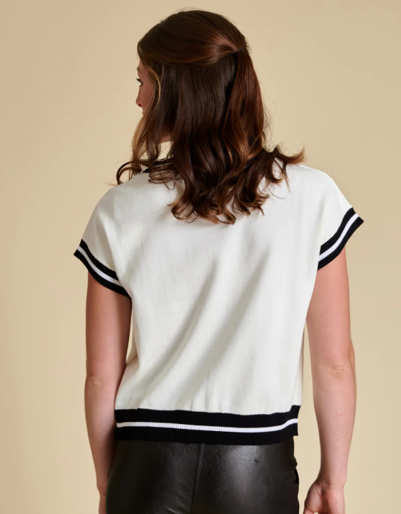 This cap-sleeve sweater channels old-school varsity style with updated rope embroidery and bold team color accents at the neck, sleeves, and hemline. Crafted from a soft acrylic-cotton blend, it offers a nostalgic yet elevated take on game day dressing. Pair it with wide-leg jeans or our matching skirt for a fresh spin.