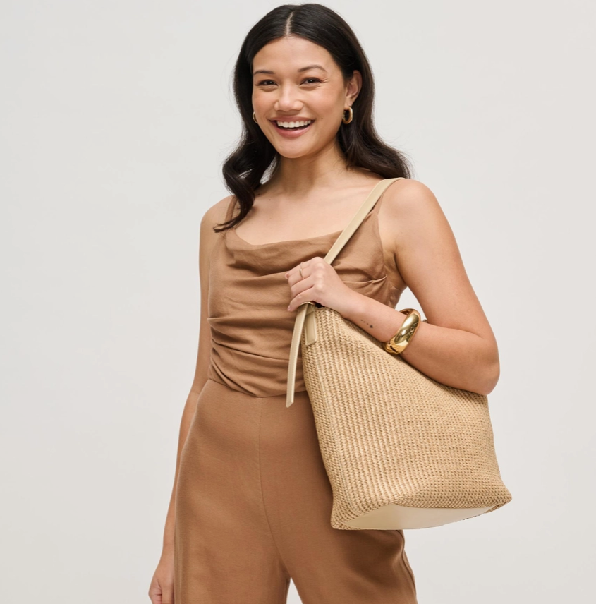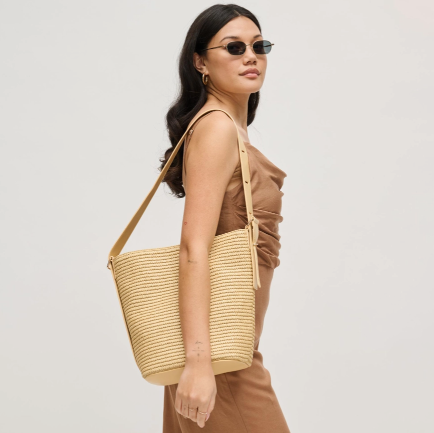 *Exterior Details: brown woven body with a flat reinforced base and leather-trimmed sides; an adjustable shoulder strap with buckle lets you customize drop for stable carry.