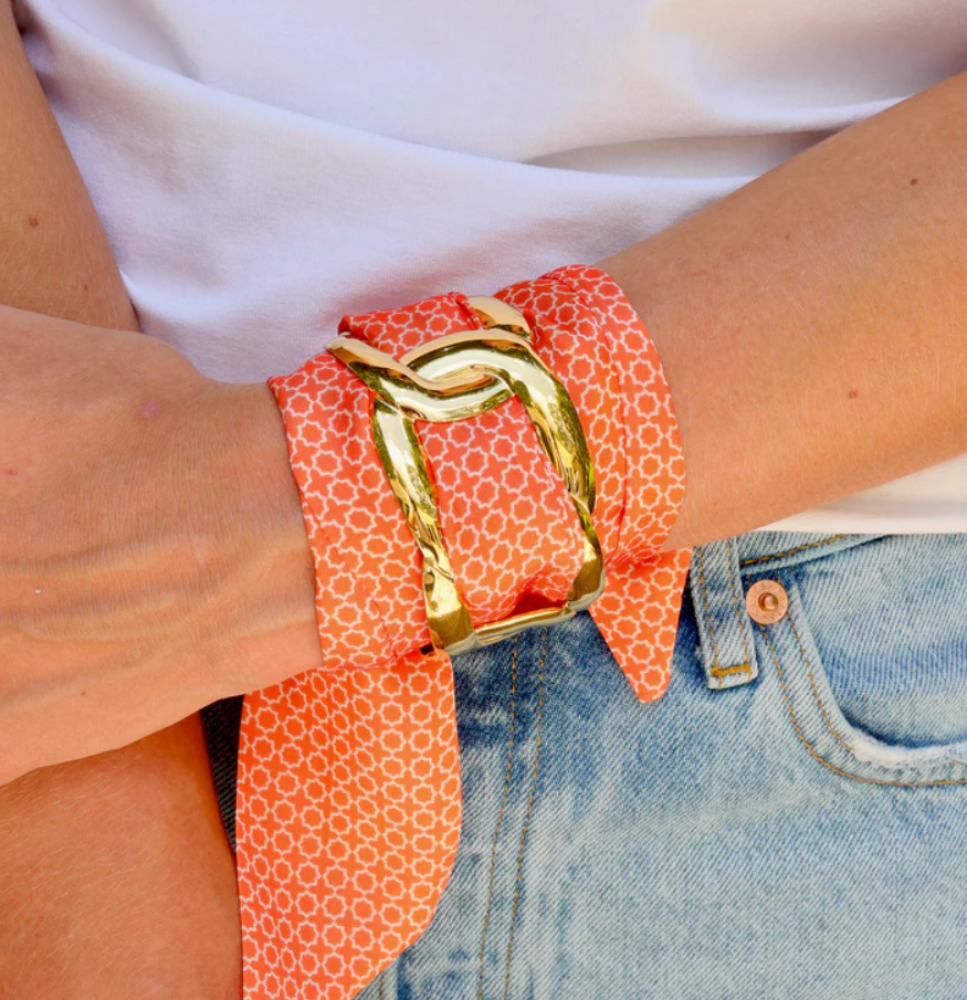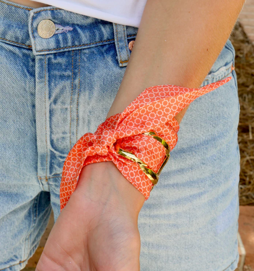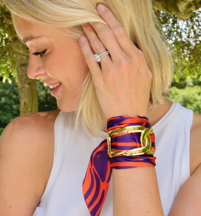 Elevate your game day style with the Serafina Scarf Bracelet. This fashionable accessory features a sleek stainless steel adjustable cuff threaded with a vibrant scarf, making it easy to show off your team colors in a chic and effortless way. Perfect for adding a stylish pop of color to your outfit while keeping comfort and versatility in mind.