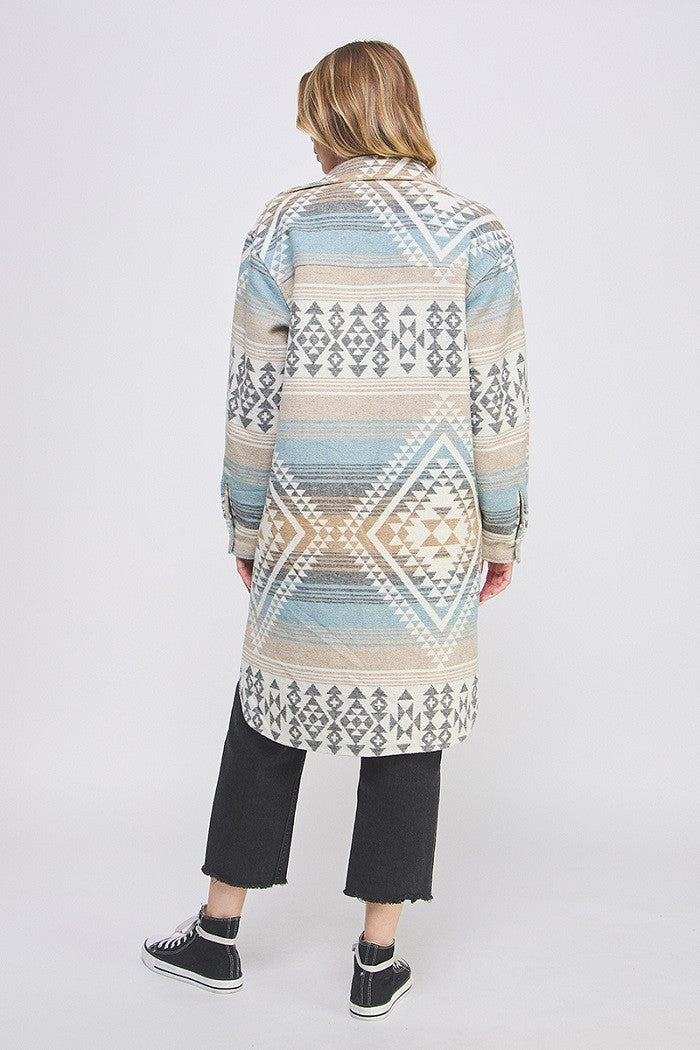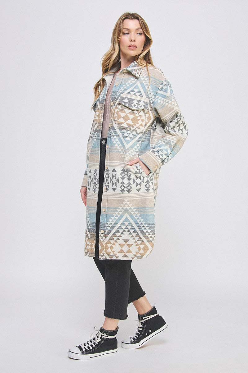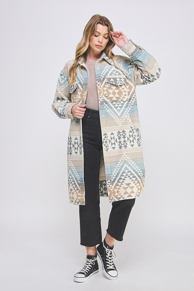 Embrace bold style with the Aleena Tribal Pattern Long Shacket. This striking piece combines the edge of a shacket with vibrant tribal patterns, making it perfect for those who dare to stand out. Its long silhouette adds drama and warmth, ideal for layering through changing seasons. Step confidently into any setting with this statement-maker in your wardrobe.
