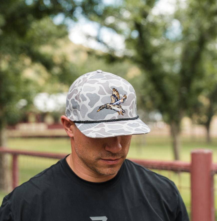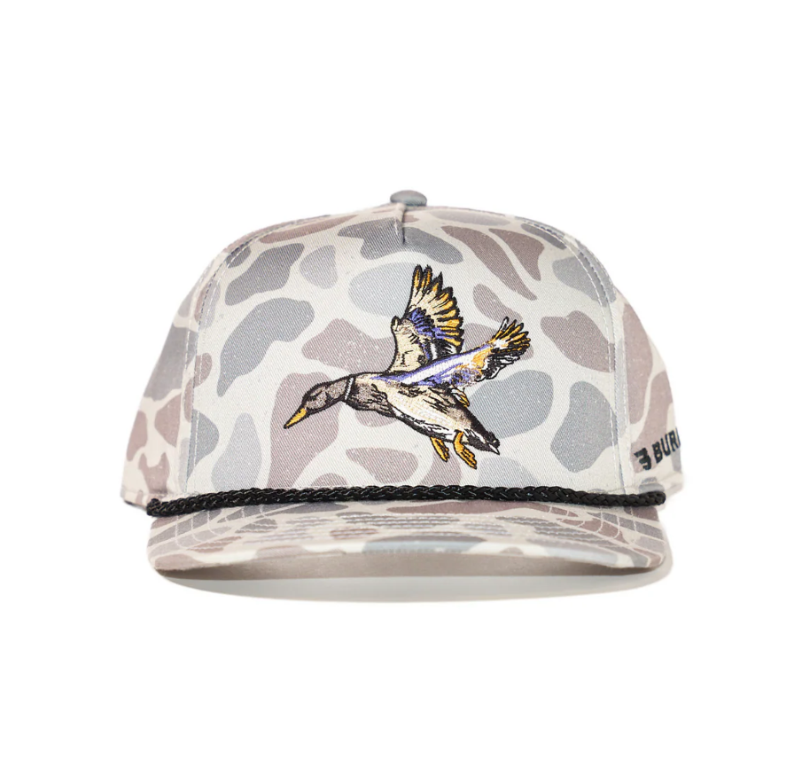 Blend in while standing out with the Diving Mallard Cap in our signature Classic Deer Camo. Featuring a dynamic embroidered mallard diving in mid-flight, this cap is a nod to the wild and a staple for any outdoorsman. The camo pattern offers a rugged, vintage-inspired look, while the structured fit and rope detail add a timeless feel. Whether you're chasing birds or just kicking back, this cap brings field-ready style wherever you go.