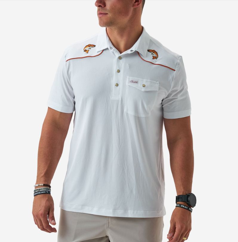 Pearl Snap Performance Polo, where style meets functionality. Made from the same premium blend of 95% Polyester and 5% Spandex as our top-selling Performance Hoodies, this polo offers unparalleled comfort and versatility. With quick-dry and moisture-wicking properties, our Performance Polo keeps you cool and dry all day long, whether you’re attending crawfish boils, date nights, sport events, work, or simply enjoying everyday activities. Plus, with the UPF 50 protection, you can stay shielded from the sun's harmful rays. Designed with Treys active lifestyle in mind, Performance Polo is tailored for a perfect fit. Trey, who stands at 6’1’’ and weighs 210 pounds, finds the size Large to be just right for him.Â