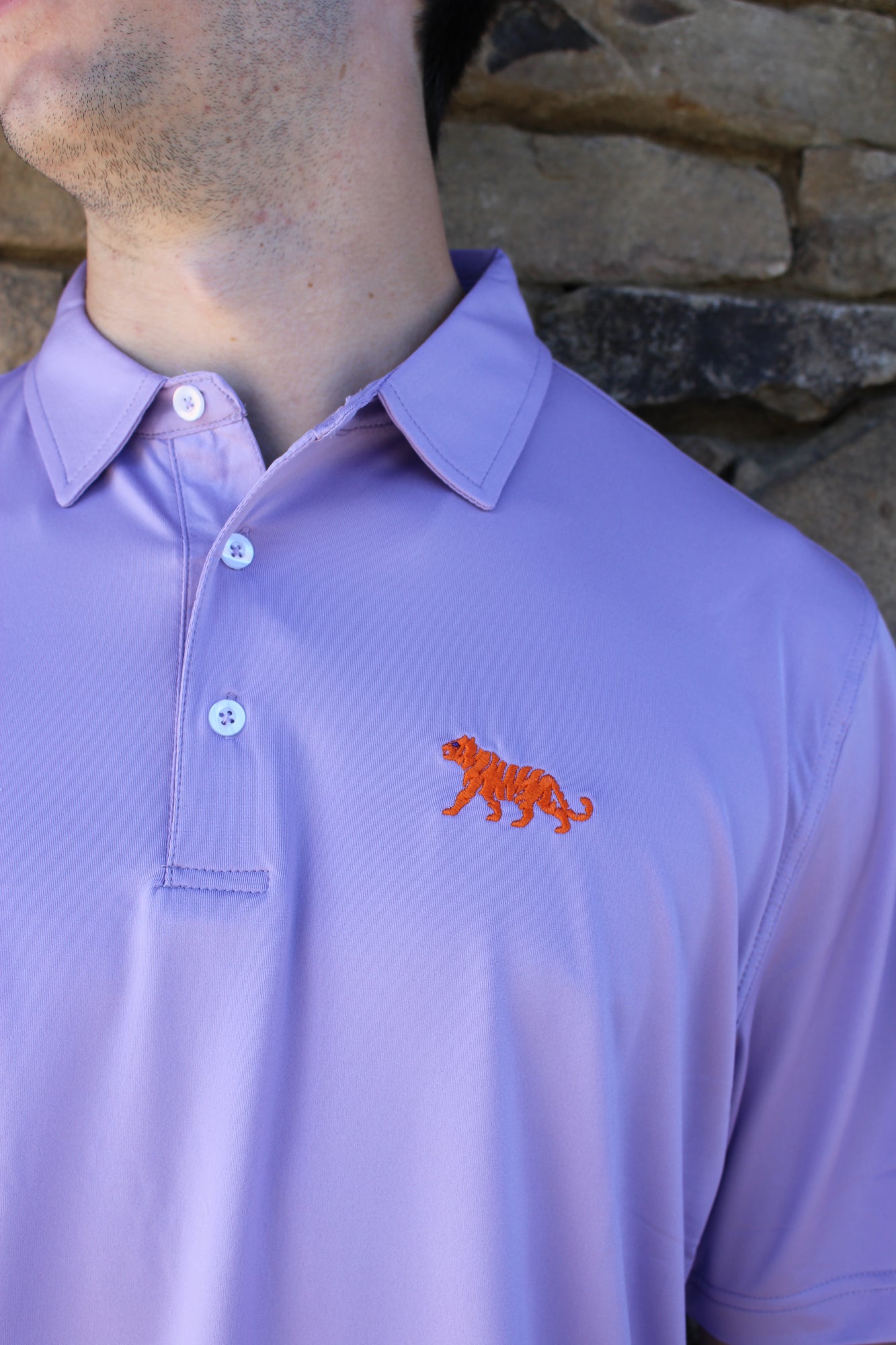 A lightweight, breathable purple fabric featuring an orange embroidered tiger.