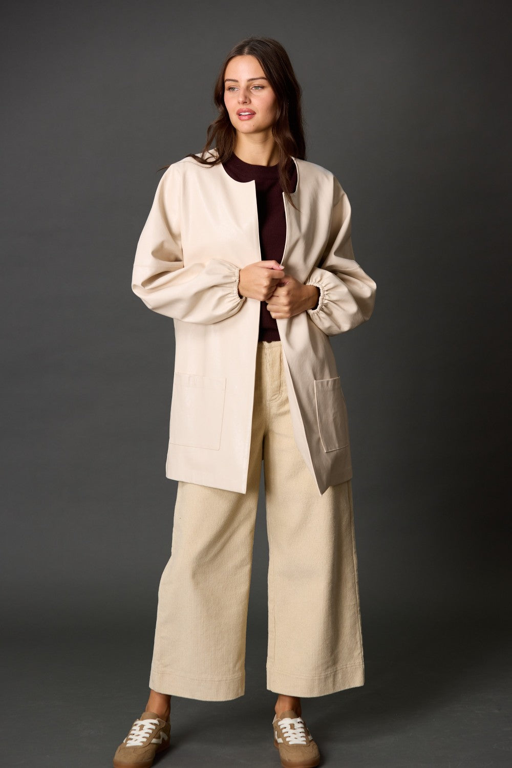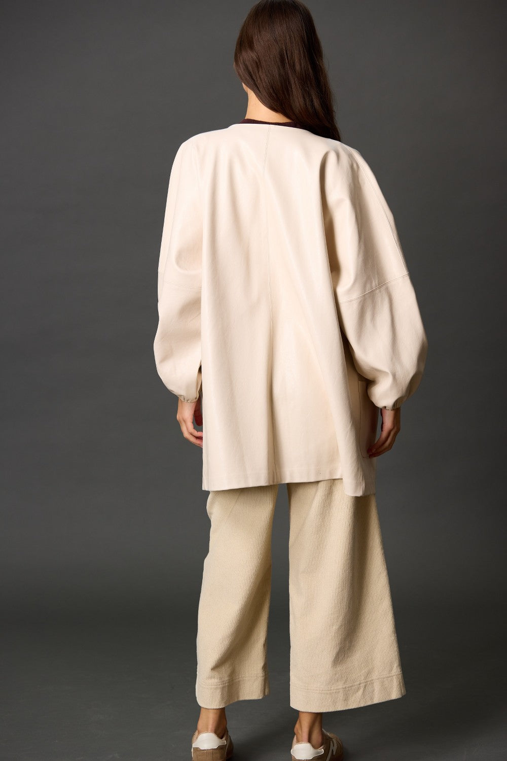 Make a bold statement with the Faux Leather Billowy Sleeve Jacket. Designed with voluminous sleeves and a sleek faux leather finish, this jacket combines edgy style with modern elegance. Its lightweight construction offers comfort without compromising on impact, making it the perfect layering piece to elevate your wardrobe and turn heads effortlessly.