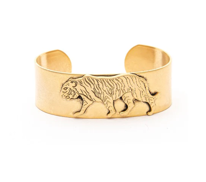 The Leomie keeps it casual with the unique tiger on a medium cuff. 22K antique gold plated over brass. Hand crafted in New York
