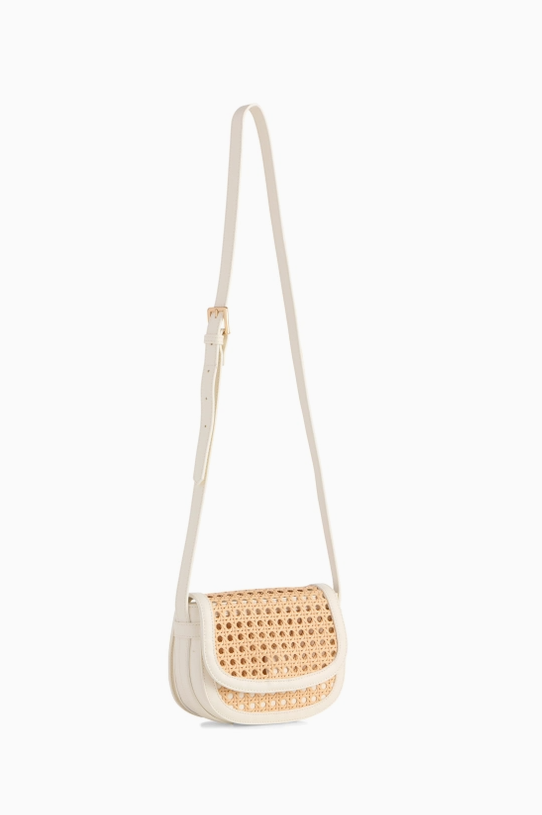 L 7.25” x W 2.5” x H 6”; adj 21.5”; pe and pu; adjustable cross-body strap; magnetic snap closure; 1 inner slip pocket
