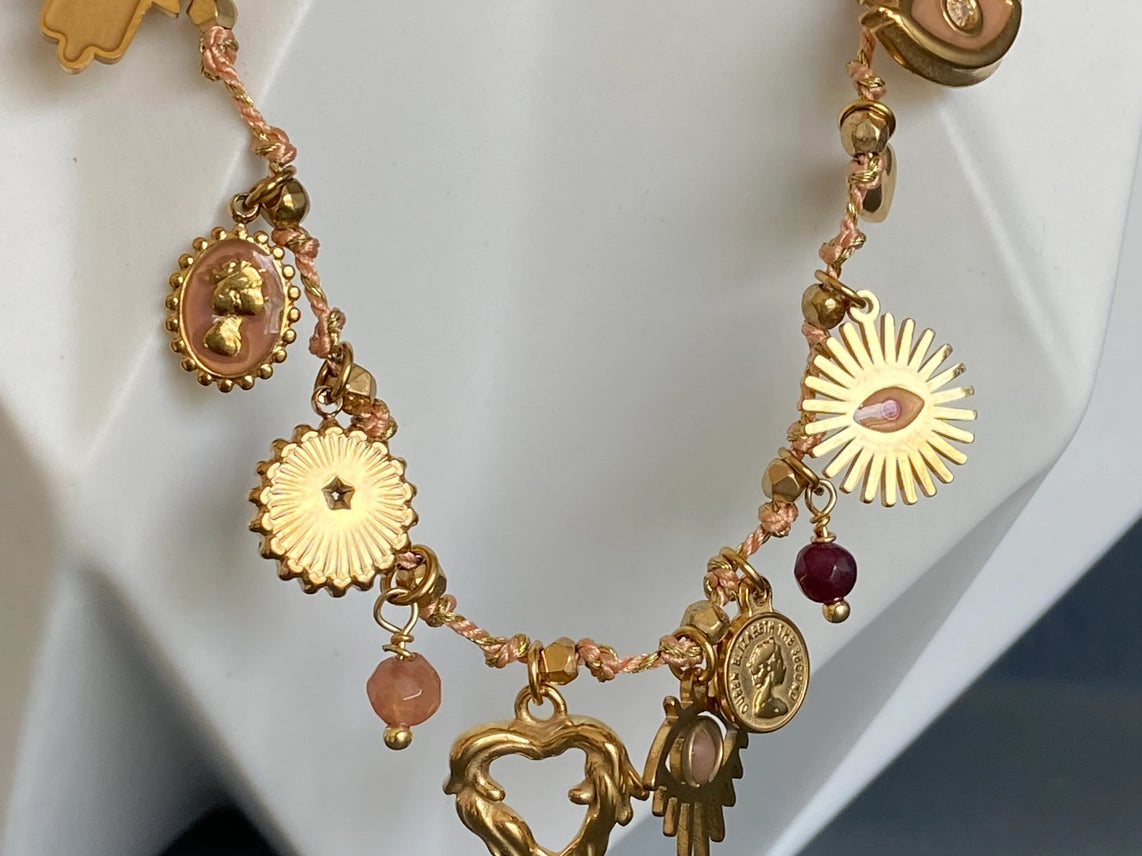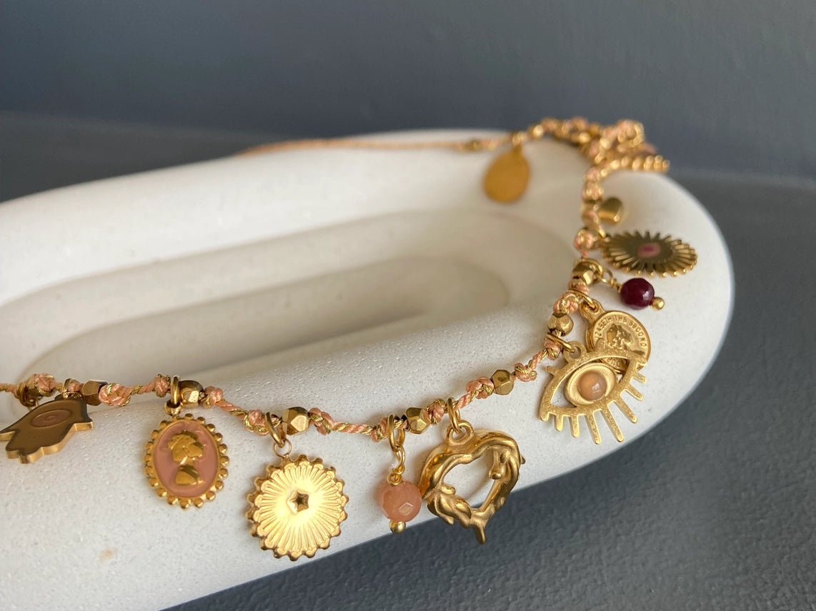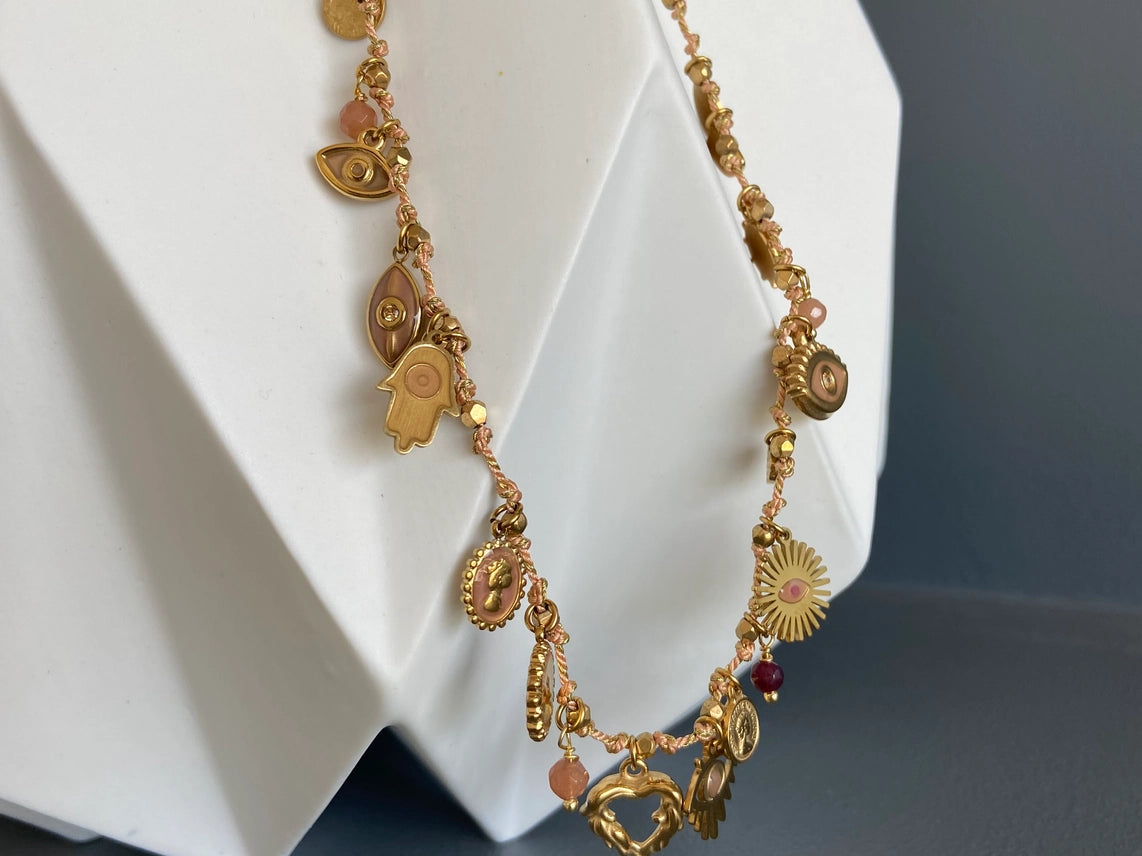 This beautiful lucky charm necklace combines elegance with a playful twist. It's a versatile accessory that effortlessly complement any outfit, whether you prefer casual look or something more chic. The charms are made of 18K gold-plated stainless steel and enamel for some of them and mounted on a string in neutral tone. Water is not advised with the string. Length: 17 to 20 inches with extender