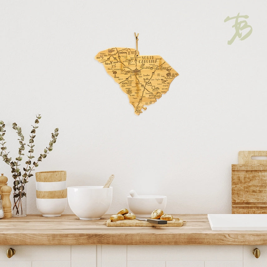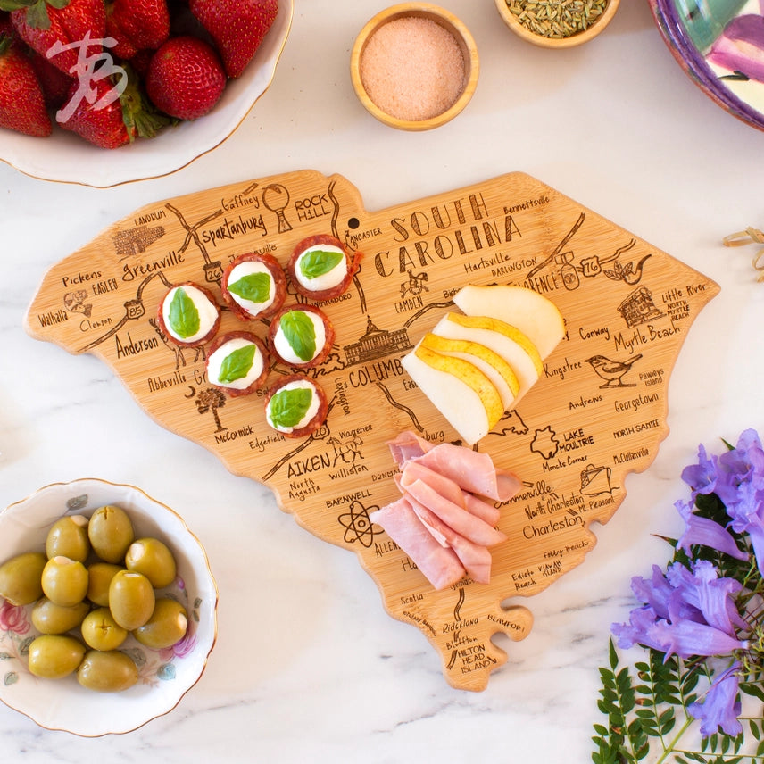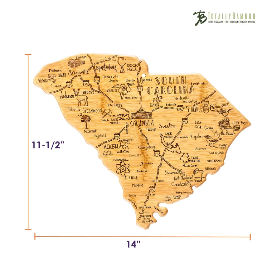 Celebrate South Carolina with this beautifully crafted bamboo cutting board! Shaped like The Palmetto State, it features laser-engraved artwork highlighting the iconic towns, landmarks, and sights that define South Carolina. Shoppers love using it as a fun, conversation-starting charcuterie board for serving crackers, cheese, meat, fruit, candy, and other favorite snacks. The blank reverse side offers all the benefits of a bamboo cutting board: a durable, lightweight, and knife-friendly cutting surface. Cut on the back and serve on the front to minimize clean up! When not in use, the included hang tie easily transforms the cheese board into eye-catching home decor.