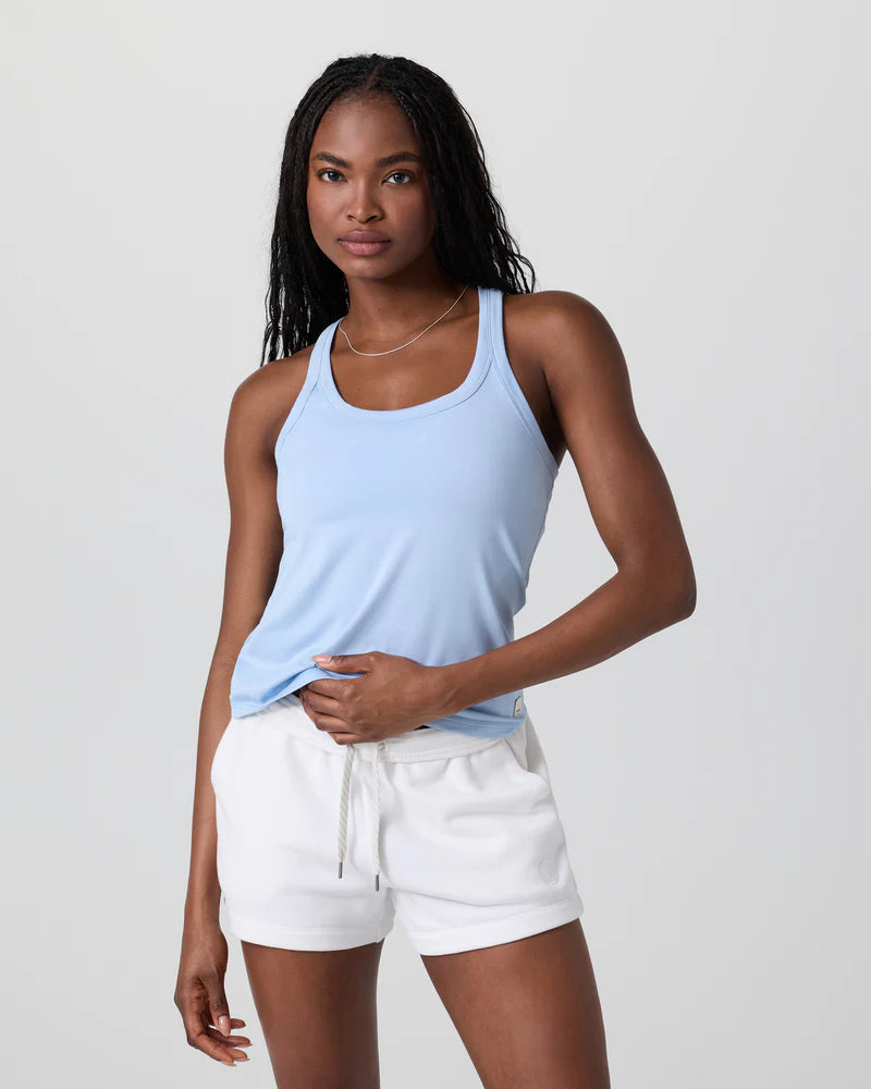 Moisture wicking performance jersey, recycled polyester, sleeveless, racerback tank, relaxed fit, woven logo patch, fitted, high hip length